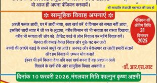 नई दिल्ली। आने वाली 10 फरवरी को बदनावर में जाट समाज के द्वारा निःशुल्क सामूहिक विवाह कार्यक्रम का आयोजन किया जा रहा है। जानकारी के अनुसार या 13वां निःशुल्क सामूहिक विवाह सम्मेलन है। जो कि डॉ. आर.एस. जाट सामूहिक विवाह समिति द्वारा आयोजित किया जा रहा है। बदनावर में जाट …